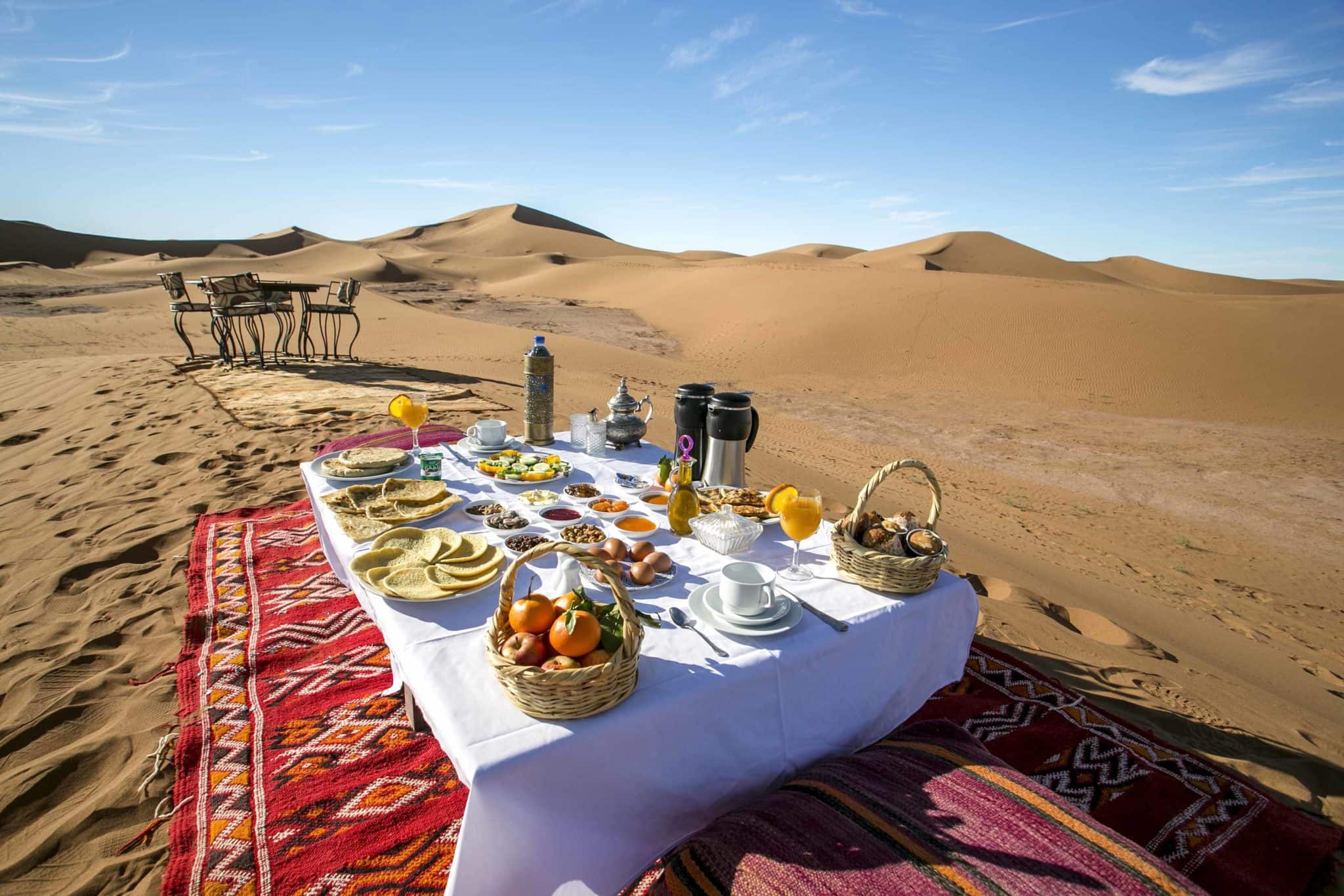 Today you will enjoy an adventure through the vast expanse of the Moroccan Sahara. Explore the dunes on a camel, a Jeep tour or an exhilarating ATV adventure, and witness the stunning desert landscape from a unique perspective. Meet the nomadic tribes that call the Sahara home and share a cup of traditional mint tea with them, gaining insight into their ancient traditions and way of life. Do not miss the chance to taste the delicious Medfouna Berber pizza, a local delicacy that will leave your taste buds wanting more. We arrive to the spectacular Merzouga dunes where sand dunes signify the start of the mighty Sahara Desert. We leave our vehicle and take a camel ride into the desert to a desert camp. To seal this as an experience of a lifetime. Spend the night in the desert in Berber tents, the ultimate glamping feeling! Add endless starry skies and music around a campfire and the picture is complete. You should not definitely miss this amazing experience in the desert during your tour of Morocco!