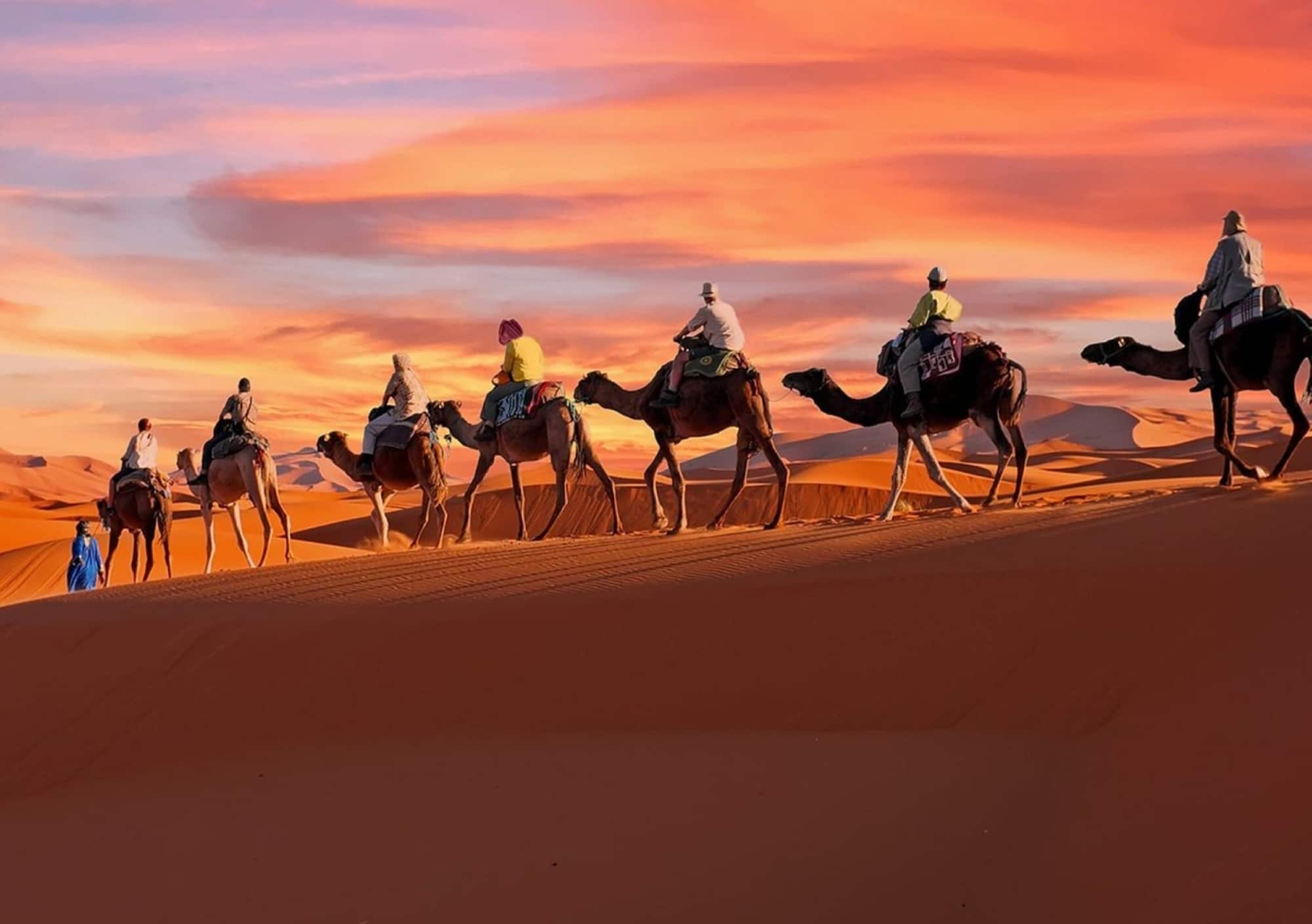 Today you will enjoy an adventure through the vast expanse of the Moroccan Sahara. Explore the dunes on a camel, a Jeep tour or an exhilarating ATV adventure, and witness the stunning desert landscape from a unique perspective. Meet the nomadic tribes that call the Sahara home and share a cup of traditional mint tea with them, gaining insight into their ancient traditions and way of life. Do not miss the chance to taste the delicious Medfouna Berber pizza, a local delicacy that will leave your taste buds wanting more. We arrive to the spectacular Merzouga dunes where sand dunes signify the start of the mighty Sahara Desert. We leave our vehicle and take a camel ride into the desert to a desert camp. To seal this as an experience of a lifetime. Spend the night in Berber tents, the ultimate glamping feeling! Add endless starry skies and music around a campfire and the picture is complete. You should not definitely miss this amazing experience in the desert during your tour of Morocco!