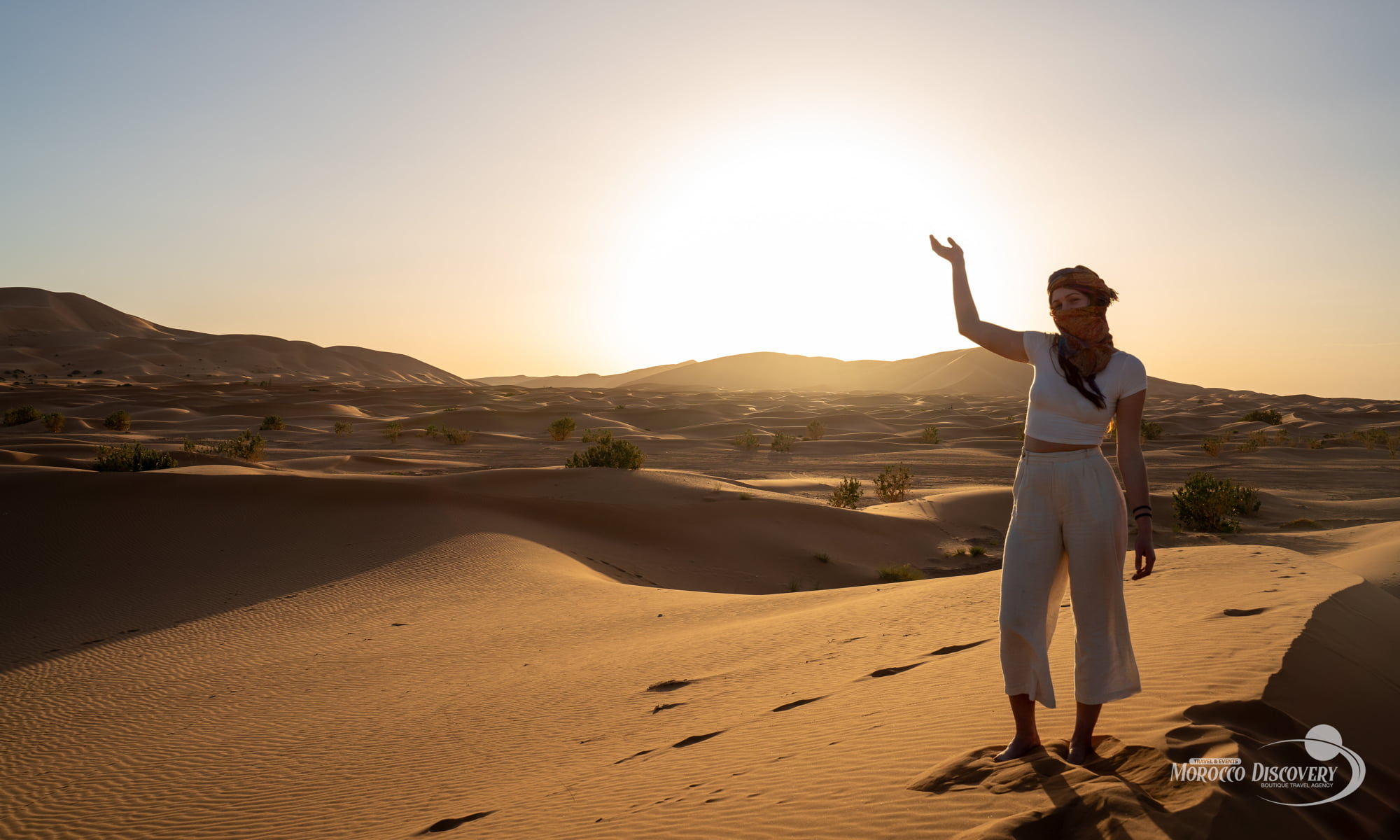 Wake up early morning to contemplate and catch the first rays of the fabulous sunrise that peacefully invades the dunes creating a wonderful mixture of colors in the middle of the Sahara Desert. Then you will have free time for a warm Moroccan breakfast. After that, you return on camels or 4x4 Jeep to Merzouga where your driver awaits. Then, we continue to Rissani Town well known for its ethnic large Souk. Afterwards, we continue to Alnif then along to the Draa Valley lined with palm trees and ancient Kasbahs. You will cross the Tizi Tinififft pass to arrive to the Hollywood of Africa Ouarzazate. Then we cross the Tizi-n-Tichka to reach Marrakech. Finally, the 3-day desert tour ends by a drop off at your accommodation or airport in Marrakech.