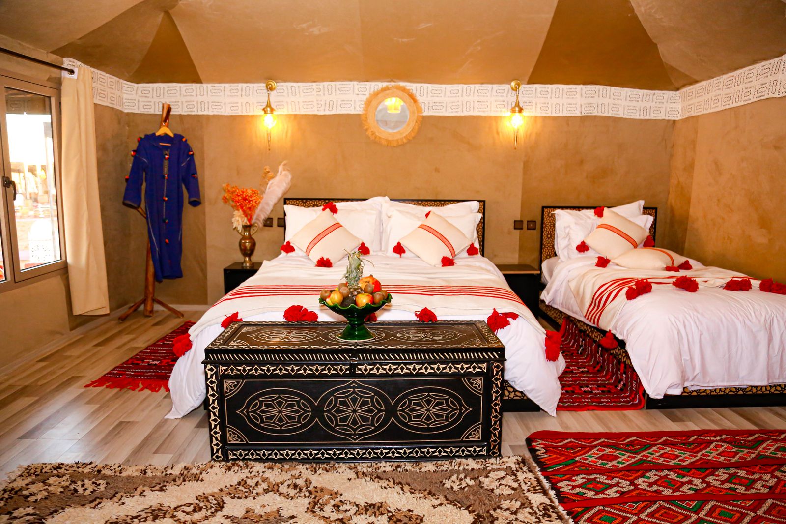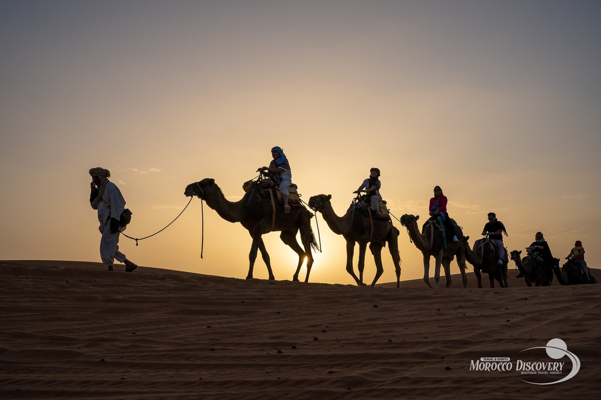 After breakfast, we drive through the Dades Valley. We stop on a spot overlooking the Valley to enjoy the spectacular landscapes of Dades gorges. Then we continue to Todra Gorges, the course of Todra river has carved out a Grand Canyon through the mountains making a high red cliff-sided canyon. Feel free to wander in the gorges and appreciate the beauty of the landscape. After that we drive through the palm groves of Touroug and Tinjdad. Feel free for lunch on the way. In the afternoon we reach the Sahara Desert of Merzouga where you will switch to camels and cross the sandy desert. A stop will be made for you to enjoy the magical sunset on top of a high dune. Then, continue to the desert luxury tented camp, where you will enjoy the Berber drums music while dancing around the campfire under the vast open sky stars. Dinner and overnight in the Camp.
