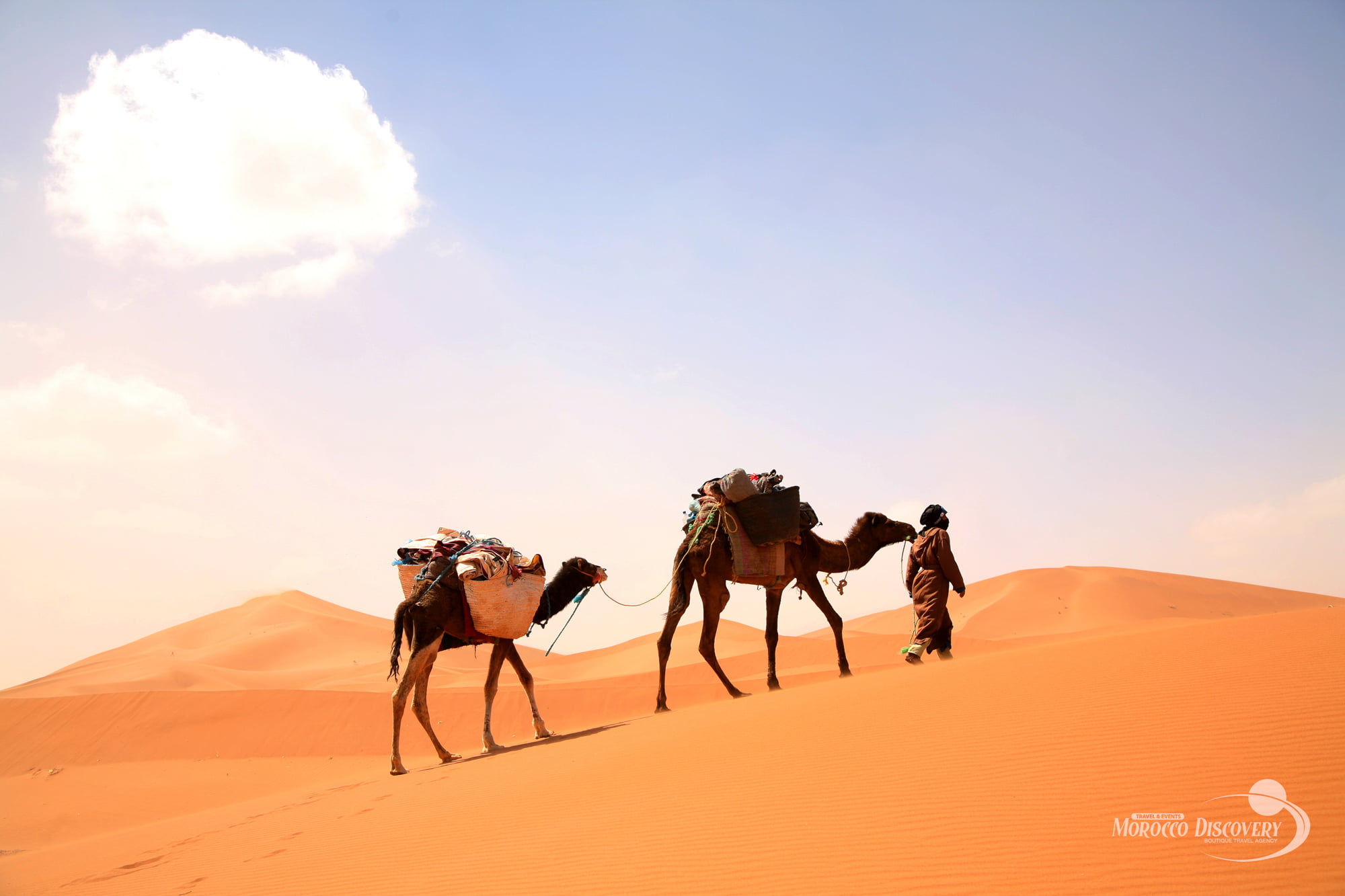 Wake up early morning to contemplate and catch the first rays of the fabulous sunrise that peacefully invades the dunes creating a wonderful mixture of colors in the middle of the Sahara Desert. Then you will have free time for a warm Moroccan breakfast. After that, you return on camels or 4x4 Jeep to Merzouga where your driver awaits. Then, we continue to Rissani Town well known for its ethnic large Souk. Afterwards, we continue to Alnif then along to the Draa Valley lined with palm trees and ancient Kasbahs. You will cross the Tizi Tinififft pass to arrive to the Hollywood of Africa Ouarzazate. Then we cross the Tizi-n-Tichka to reach Marrakech. Finally, the 3-day desert tour ends by a drop off at your accommodation or airport in Marrakech.