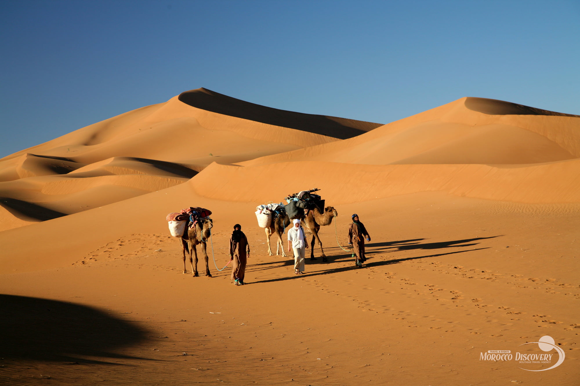We start our trekking around 8.00 am towards the great dunes of Zahar. After about 3 hours of walking, we reach the beautiful oasis Rase Nkhal with dozens of palm trees. An example of ecotourism. The lunch break with a cup of mint tea that will give us the energy for another 3 hours of riding or walking. After another 2 hours, we reach our second night camp. We set up our tents between sand dunes and Tamarisk trees. We enjoy our dinner around the campfire and the night under the starry sky or tent. L/D