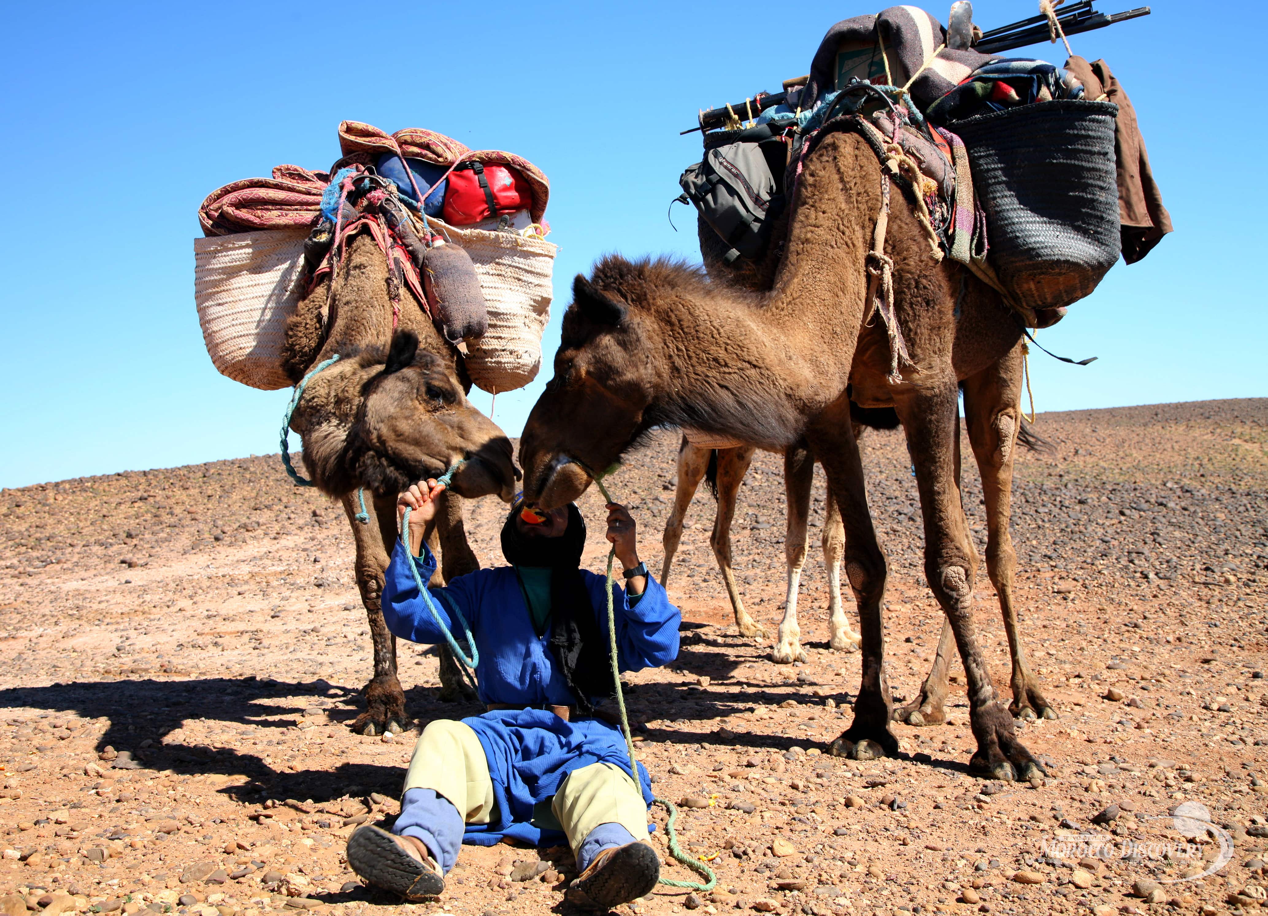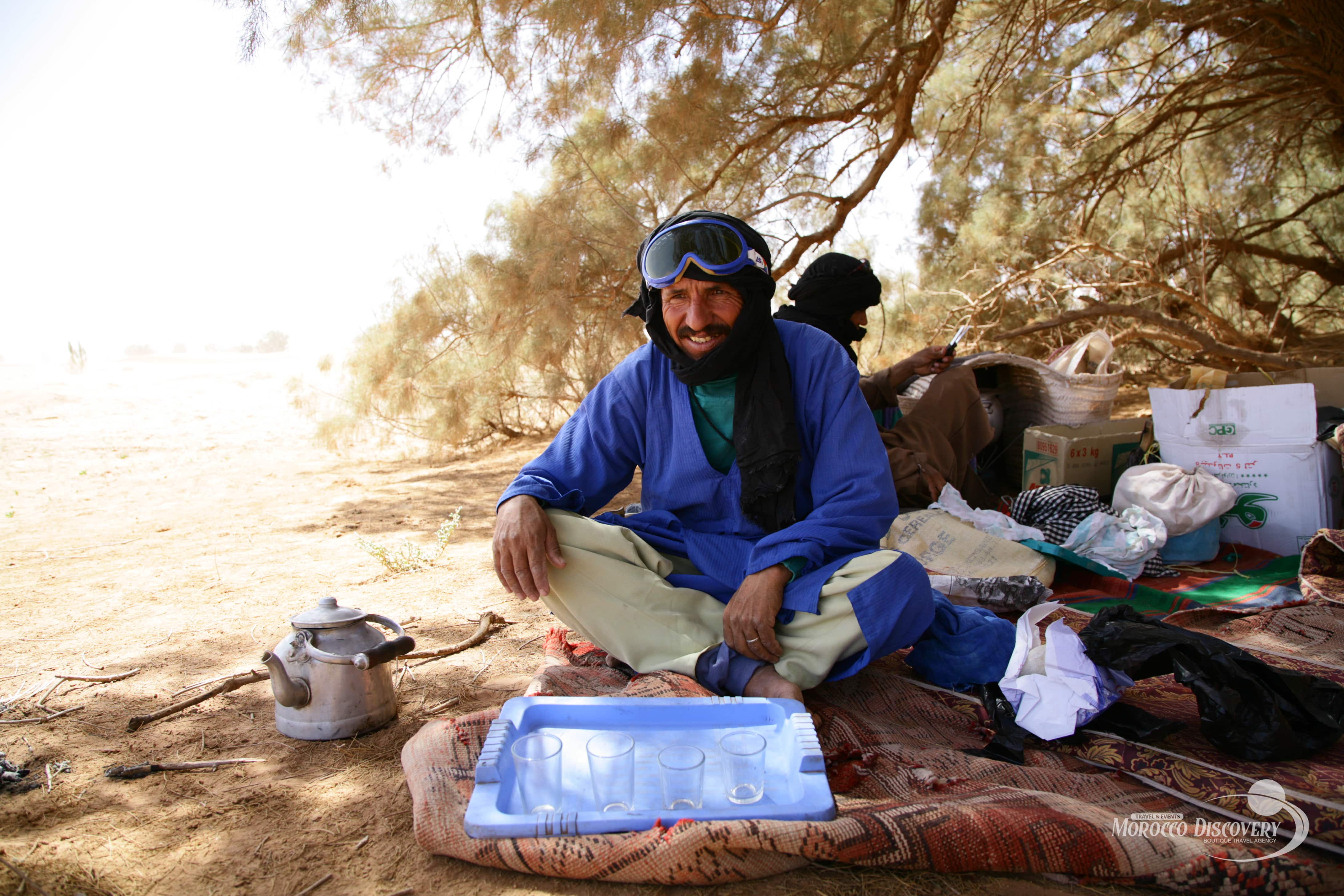 Wake up early in the morning to enjoy the sunrise and breakfast served in a Moroccan way. We then continue our trip discovering more of the Sahara Desert Morocco Sand dunes and stones before stopping for lunch and enjoying a cup of mint tea. Afterwards, we continue our Camel Trekking and riding/walking towards the dunes of Mezouaria, where we will spend the night either in the tent or in the open air under the starry sky.