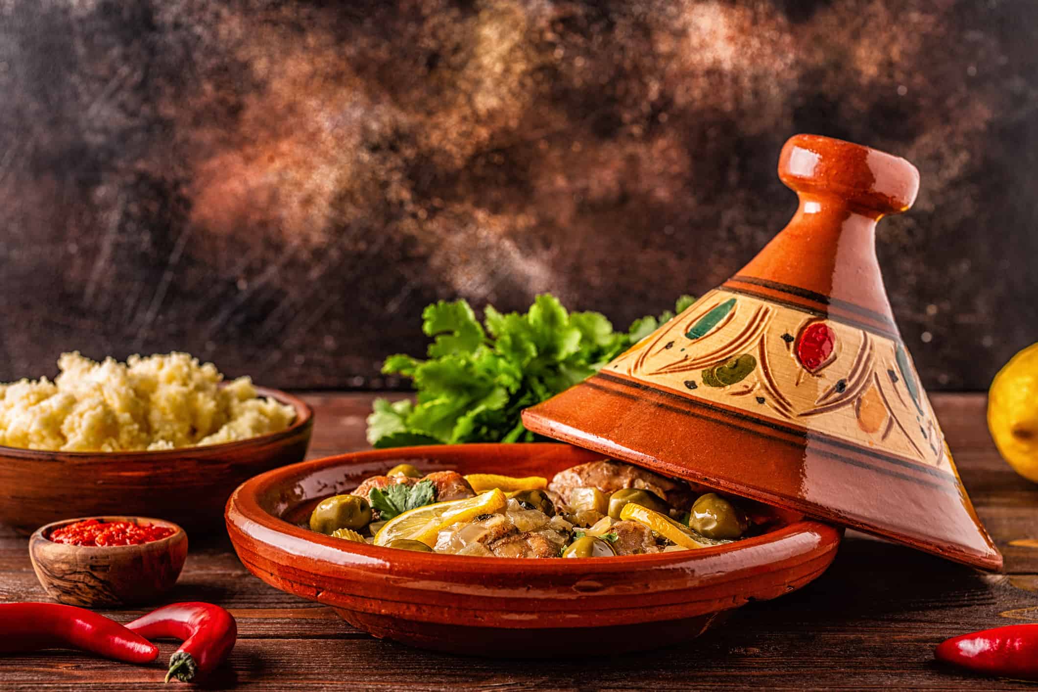 Moroccan food is full of flavor and spices. It makes you want to eat until you can’t possibly eat any more. From the first course of bread and salads to the main dish of delicious tagine, from the fresh fruit and Moroccan cookies for dessert to traditional sweet mint tea, a Moroccan meal is always a treat.
