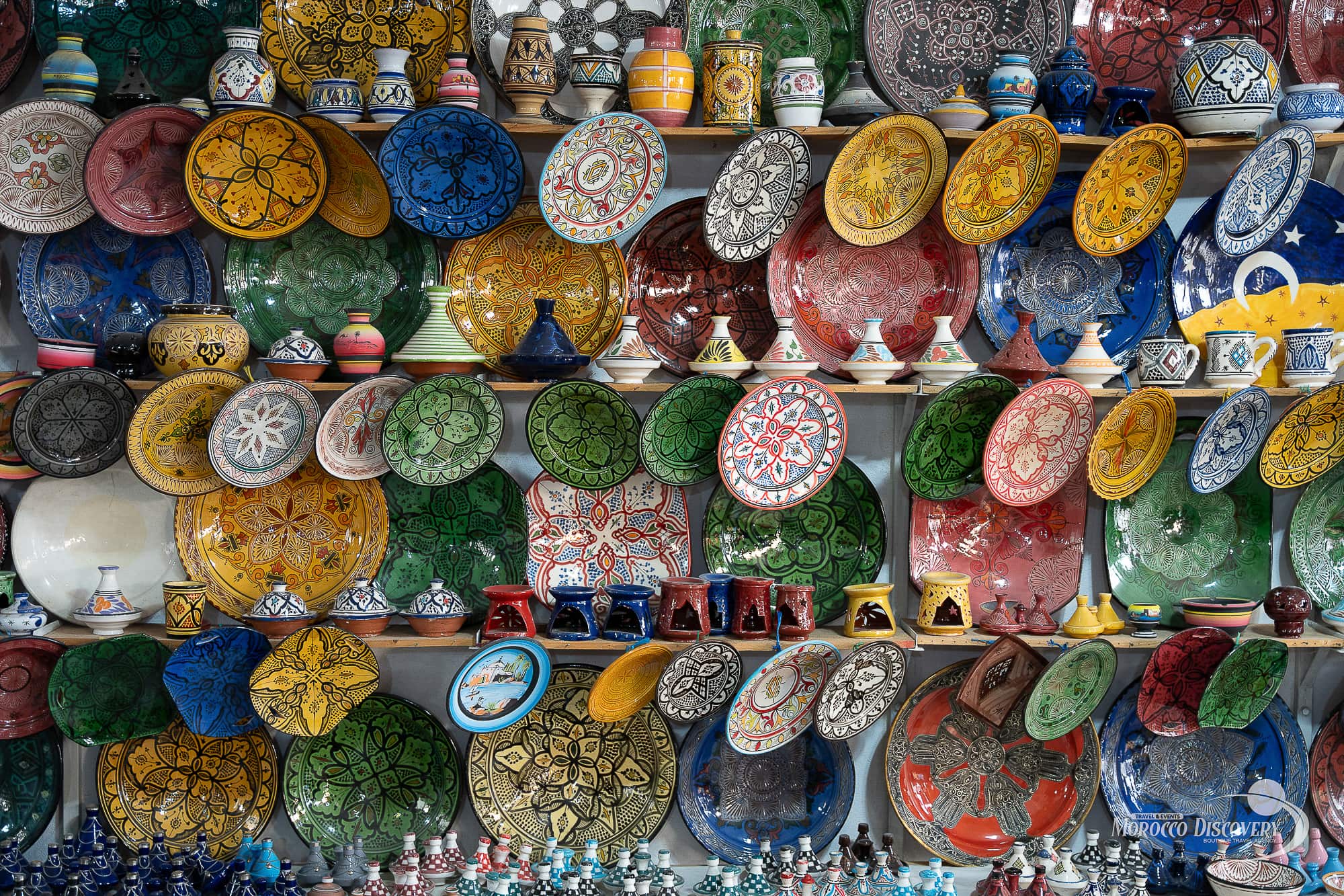 Pottery ranges from the rough earthenware of household pots and crocks to gaudy (and predominantly tourist-orientated) designs and beautiful blue and white, green or colored ceramics from the main pottery centers of Safi, Fez, Meknes and Salé. Marrakech and Essaouira both have extensive pottery souks. The more refined, detailed (and expensive) pieces usually come from Fez, while Safi is famous for its dark-green-colored pieces. In Marrakech you can find almost anything, including modern takes on traditional designs.